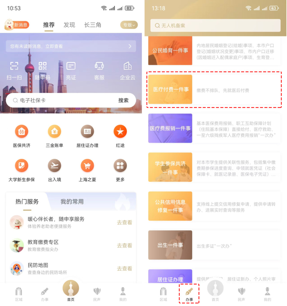 实名登录“随申办市民云”APP→点击“办事”频道→点击“医疗付费一件事”进入服务页;