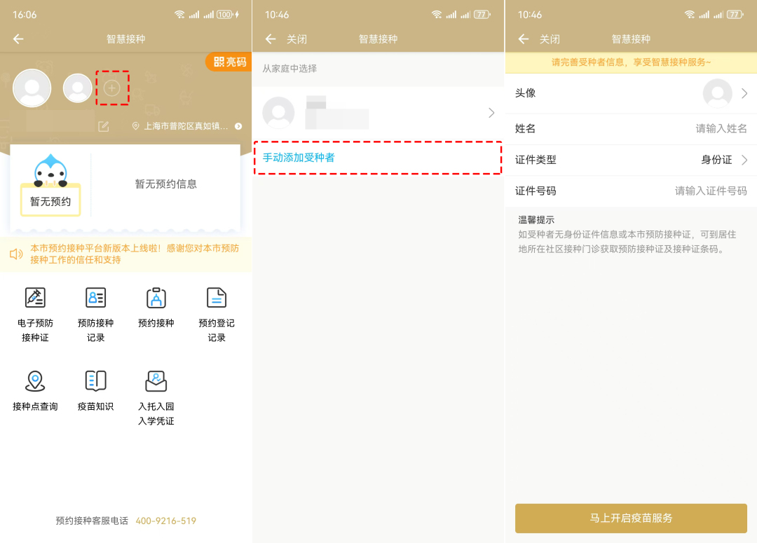 点击页面右上方的“⊕”→点击“手动添加受种者”→填写受种者个人信息,完成绑定受种人;