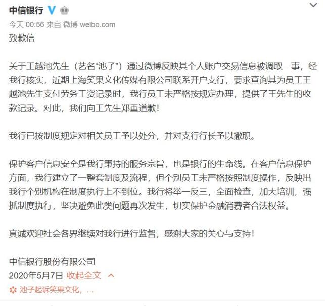 中信银行称,关于王越池先生(艺名“池子”)通过微博反映其个人账户交易信息被调取一事,“经核实,近期上海笑果文化传媒有限公司联系开户支行,要求查询其为员工王越池先生支付劳务工资记录时,我行员工未严格按规定办理,提供了王先生的收款记录。对此,我们向王先生郑重道歉。”