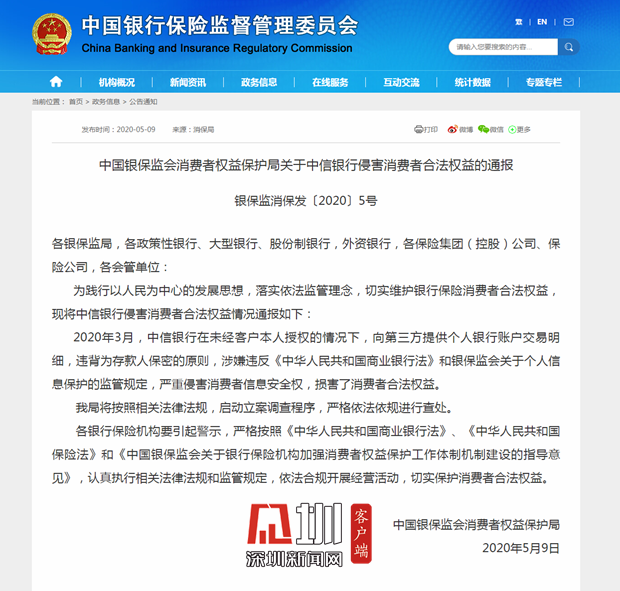 5月9日,银监会消费者权益保护局发布通报,将对此事启动立案调查程序。通报中称,中信银行未经客户本人授权,向第三方提供个人银行账户交易明细,违背为存款人保密的原则,严重侵害了消费者信息安全权,损害了消费者合法权益。