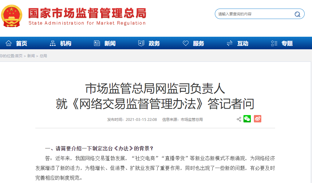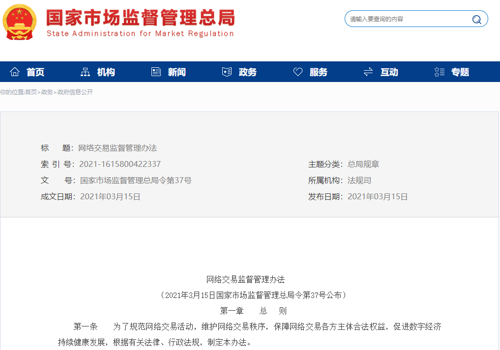 3月15日晚间,国家市场监督管理总局网站发布《网络交易监督管理办法》。