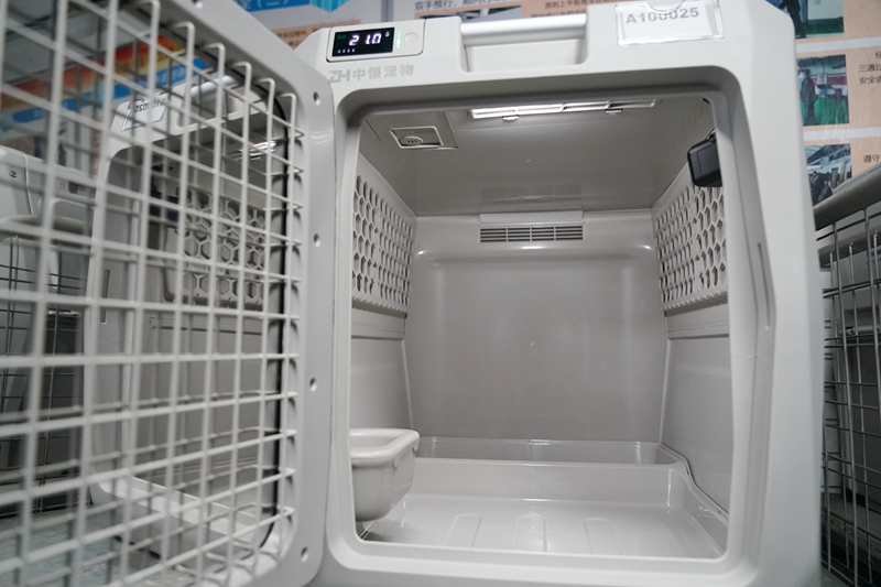 这是4月10日拍摄的高铁专用宠物运输箱,箱子自带空气循环系统、含氧量和温湿度监测及降噪、除味等功能。