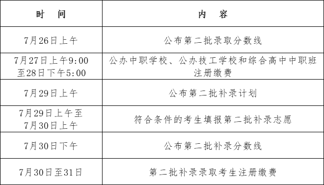 已被第二批学校(公办中职学校、公办技工学校和综合高中中职班)录取,但没有按规定时间注册的考生,作自动放弃录取结果处理,不得参与7月29日的第二批学校的补录,可以参加第三批学校(本市民办中职学校、民办技工学校)录取。