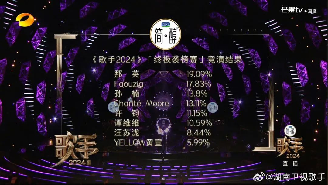 今(12日)晚,《歌手2024》第十期竞演落下帷幕。竞演结果公布:第一名 那英、第二名Faouzia凡希亚、第三名孙楠、第四名 香缇莫Chante_Moore、第五名许钧TheTree、第六名谭维维、第七名汪苏泷、第八名YELLOW黄宣。