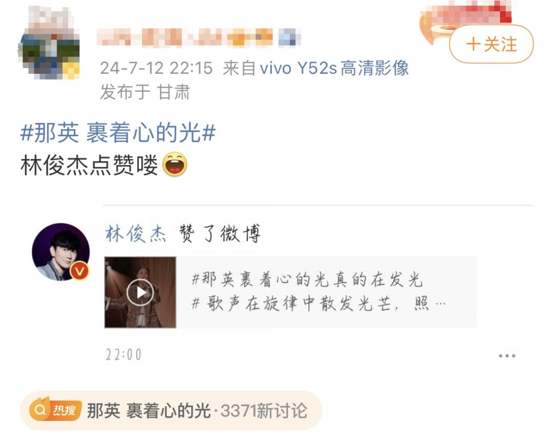 有网友发现,林俊杰默默点赞了那英《裹着心的光》。