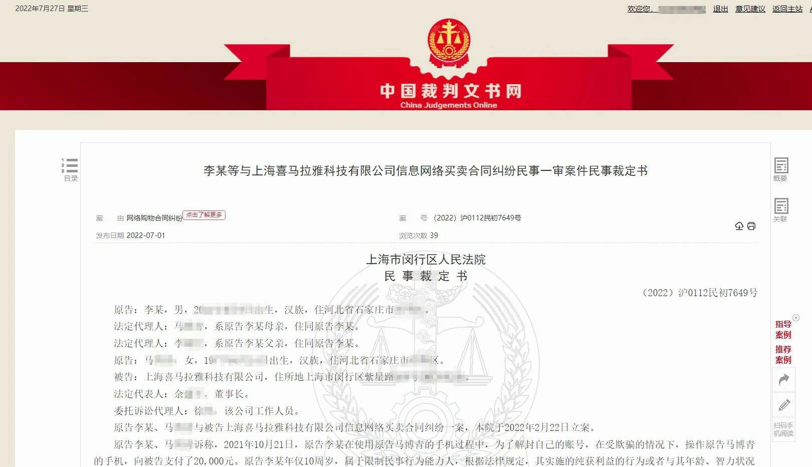 另有上海市闵行区人民法院2022年发出的一份民事裁决书载明,因10岁儿童误充值2万元,当事人李某和其母亲马某青起诉上海喜马拉雅科技有限公司,“喜马拉雅”也提出管辖异议,认为其平台《喜马拉雅用户服务协议》明确载明,争议应提交协议签订地人民法院(即上海市浦东新区人民法院)管辖。闵行区人民法院审理后认为,被告“喜马拉雅”提出的管辖权异议成立,将该案移送至了上海市浦东新区人民法院处理。