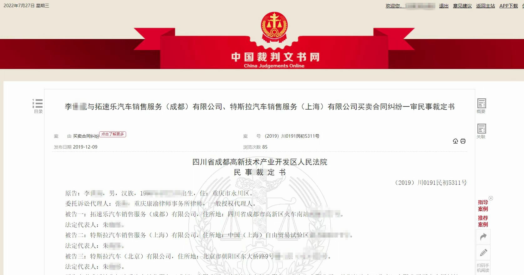 例如,四川省成都高新技术产业开发区人民法院2019年作出的一份民事裁定书显示,住在重庆市的原告李某成起诉拓速乐汽车销售服务(成都)有限公司、特斯拉汽车销售服务(上海)有限公司、特斯拉汽车(北京)有限公司三家企业。拓速乐汽车销售服务(成都)公司和特斯拉汽车销售服务(上海)公司提出管辖异议,认为《汽车订购协议》明确约定了管辖法院为北京市大兴区人民法院,四川省成都高新技术产业开发区人民法院对该案无管辖权。四川省成都高新技术产业开发区人民法院裁决将该案移送至北京市大兴区人民法院处理。