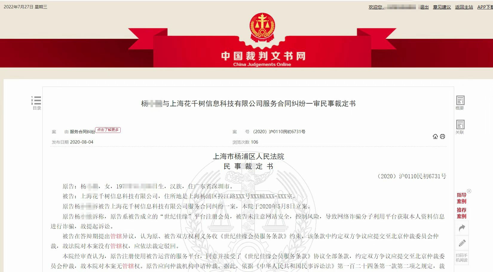 例如,2020年5月,由上海市杨浦区人民法院发出的一份民事裁定书载明:原告杨某娥起诉“世纪佳缘”母公司上海花千树信息科技有限公司。杨某娥是“世纪佳缘”平台注册会员,诉称因“世纪佳缘”未注意网站安全、控制风险,导致网络诈骗分子利用平台获取其资料信息进行诈骗,故提起诉讼。上海花千树信息科技有限公司提出管辖权异议,认为依据《世纪佳缘会员服务条款》的约定,双方争议应提交至北京仲裁委员会仲裁,故上海市杨浦区人民法院对该案没有管辖权,应依法裁定驳回。上海市杨浦区人民法院经审查认为,原告注册使用被告运营的服务平台,同意并接受了《世纪佳缘会员服务条款》协议全部条款,约定双方争议应提交至北京仲裁委员会仲裁,故本院对该案无管辖权。原告应向仲裁机构申请仲裁。依据《民事诉讼法》,上海市杨浦区人民法院驳回了原告杨某娥起诉。