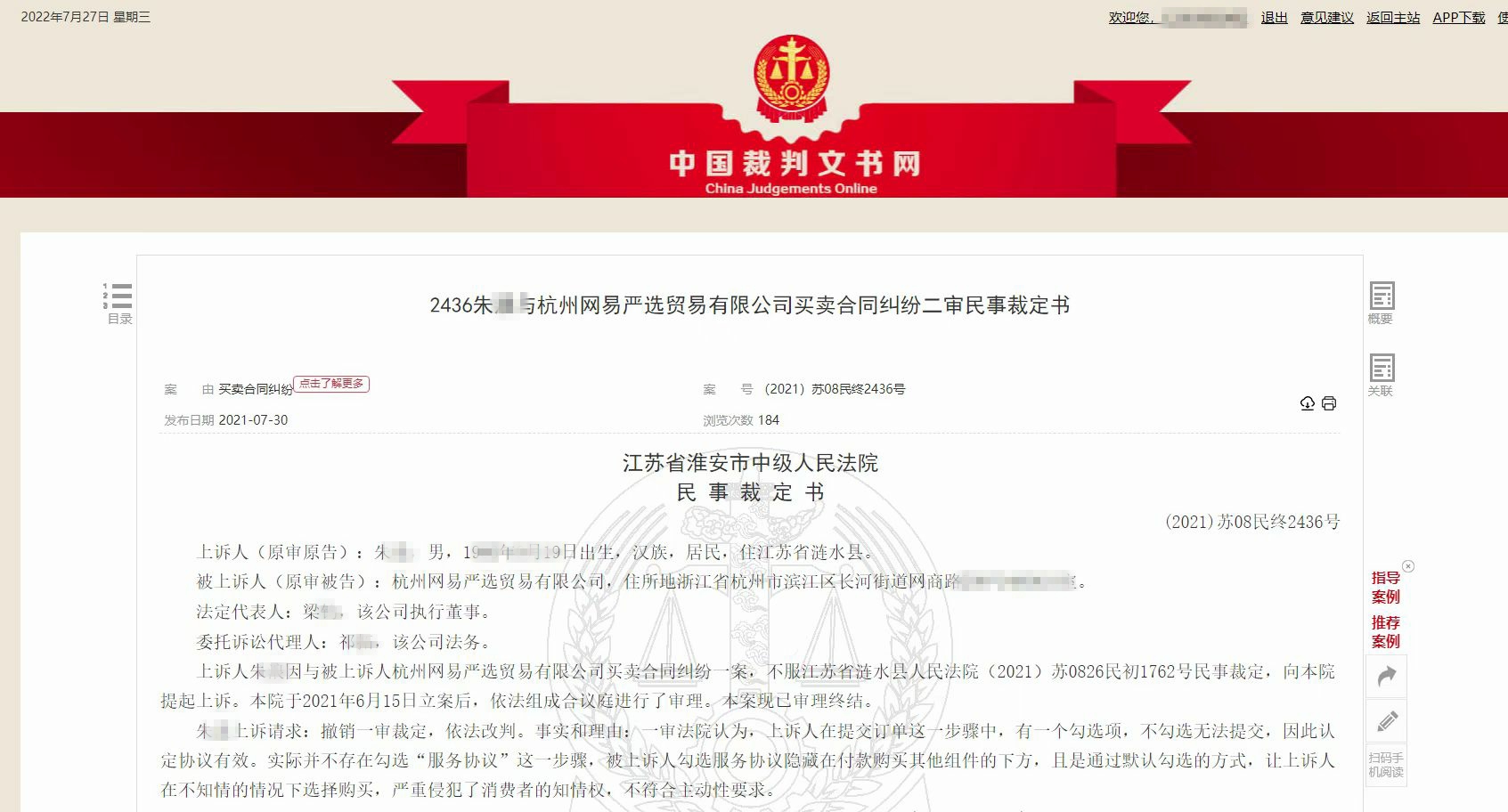 另一份由江苏省淮安市中级人民法院2021年发出的民事裁定书载明,原告朱某起诉杭州网易严选贸易有限公司买卖合同纠纷案,“网易严选”在一审时即根据指定仲裁条款提出管辖异议,负责一审的涟水县人民法院审理认定,虽然该协议系格式协议,但被告是以醒目加粗字体显示该仲裁条款,故可以视为被告已尽提示说明义务。原、被告之间的仲裁条款合法有效,该案应由中国国际经济贸易仲裁委员会先行仲裁,被告提出的异议理由成立,原告的起诉应予以驳回。朱某上诉,淮安市中级人民法院二审维持原判。