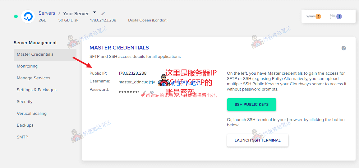 Master Credentials界面,可以看到你的服务器ip(Public IP),SSH/SFTP的账号(Username)和密码(Password)