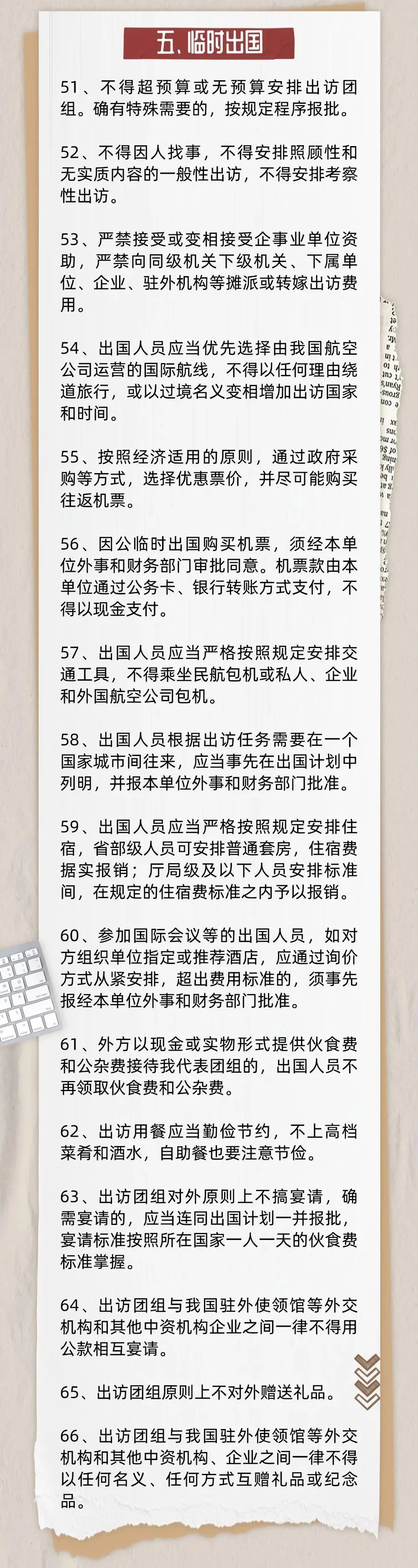 4.要规范出访活动,从外交工作大局需要出发合理安排出访活动,严格控制出访随行人员,严格按照规定乘坐交通工具,一般不安排中资机构、华侨华人、留学生代表等到机场迎送。