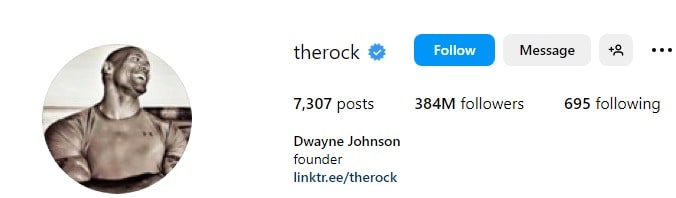 The renowned actor and former WWE champion Dwayne Johnson secures the fifth position among Instagram users with the largest following. With a count of 383 million followers, he has amassed a substantial and devoted audience on the platform. While his initial claim to fame stemmed from his time as a wrestler, his more recent ventures have exclusively revolved around the entertainment industry.
