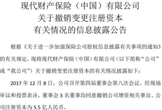 2016年,现代财险发布的增资公告信息:“为应对高速发展的中国保险行业竞争环境,同时满足公司业务结构调整及业务发展需求,公司申请2016年增加注册资本金人民币2亿元。”该次增资计划并未打算引入新股东。