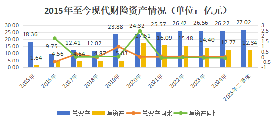 首先从资产情况来看,现代财险总资产规模整体呈现上升态势。该公司总资产先于2016年大幅下滑,之后趋于平稳,而后又于2019年大幅增加,之后以相对平稳的状态缓慢上升,于2023年达到26.56亿元,之后2024年小幅下降至26.22亿元。截至2025年二季度,该公司总资产达27.02亿元,较2024年底增加了0.8亿元。