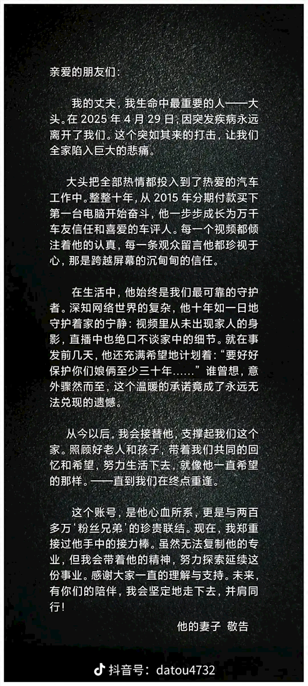 快科技6月10日消息,近日,百万粉丝账号“大头评车”在其账号发布一则讣告,称“大头评车”已于今年4月29日突发疾病去世。