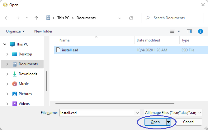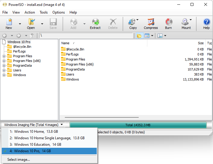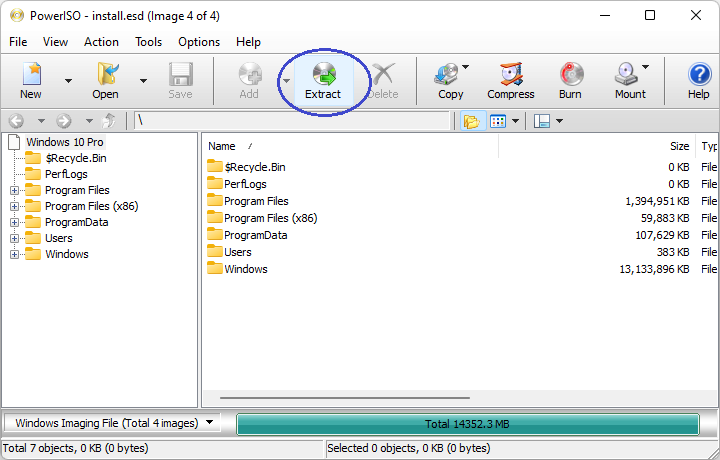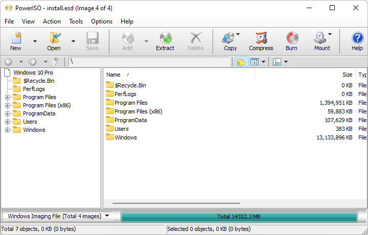 PowerISO can open an ESD file, list and extract files within the ESD file. You can also convert an ESD file to WIM file, and vice vesa. To open an ESD file, please follow the steps,