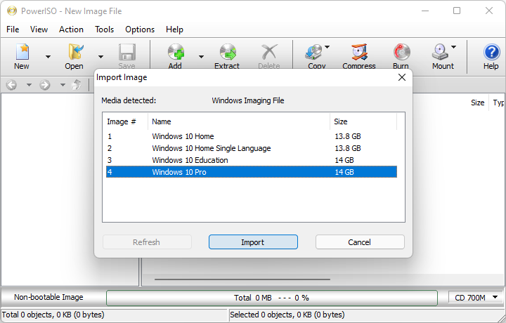 If there are more than one image in the ESD file, PowerISO will list all images in the ESD file. Select the image you want to open, and click "Import" button.