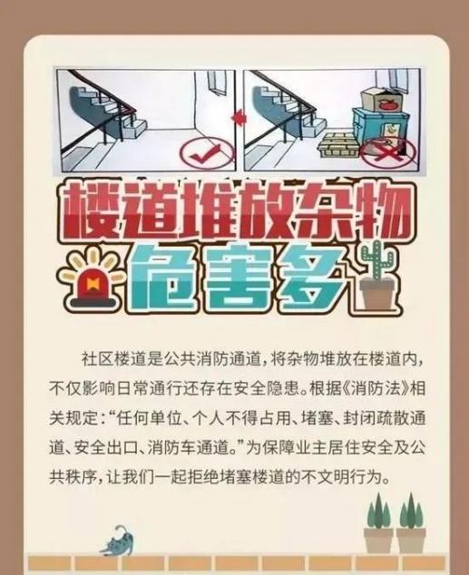 生活中,小到垃圾、废纸,大到家具等,这些都是不能放在楼道里的。在楼道堆放杂物,不仅会造成通道被堵,更危险的是,如果堆放的杂物为易燃品,一旦接触到火种,很容易引发火灾。杜绝楼道等区域乱堆乱放行为,不仅有利于改善居民的生活环境,同时也为周边乱堆放杂物的居民敲响安全的“警钟”,有利于把安全隐患扼杀在摇篮中。