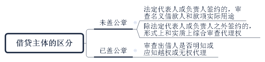 形式上,法院可审查名义借款人身份、约定款项用途、签约人披露的身份、签约人与单位的关系、盖章情况。若名义借款人是单位或其下属部门,合同上载明借款用于单位经营或生产,签约人明示借款行为系职务行为或曾出现在涉案项目工地,合同上加盖项目部章或由项目负责人签字确认,出借人也曾核实签约人身份和代理权限等,一般可认定单位为借款主体。反之,应从实质上进一步审查,不能仅因此否定单位为借款主体。