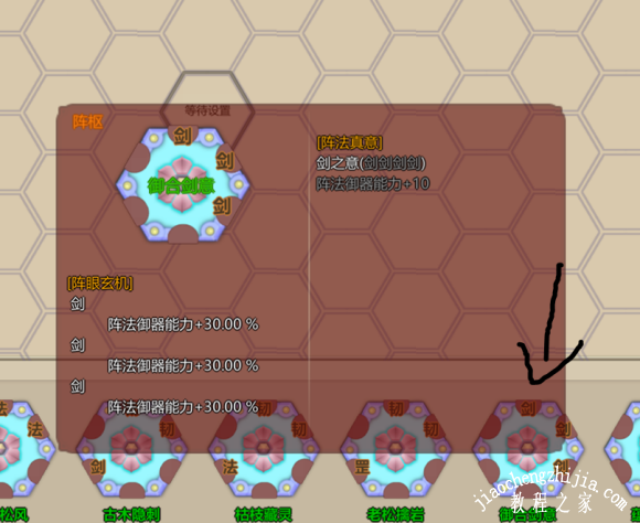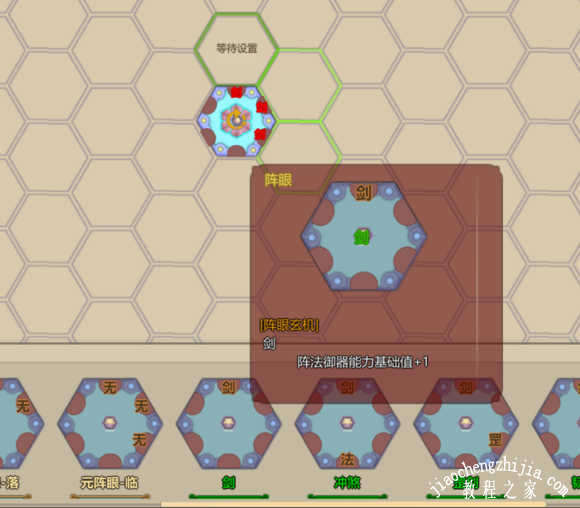 然后阵枢那几个有剑字的相邻格变绿,就是阵眼了,点击阵眼,底下就会出现你可以用来做阵眼的各种配置,咱们选择只有一个“剑”字的。