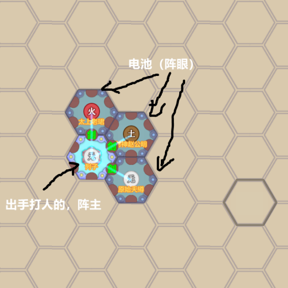 一、一个主力小人打架,只有主力小人动手,他叫做阵枢,后面几个人作为给主力充电的电池,不动手,就是阵眼了
