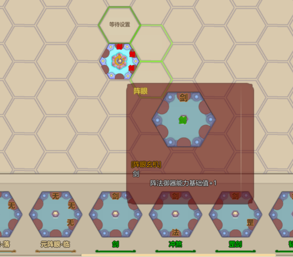 然后阵枢那几个有剑字的相邻格变绿,就是阵眼了,点击阵眼,底下就会出现你可以用来做阵眼的各种配置,咱们选择只有一个“剑”字的。