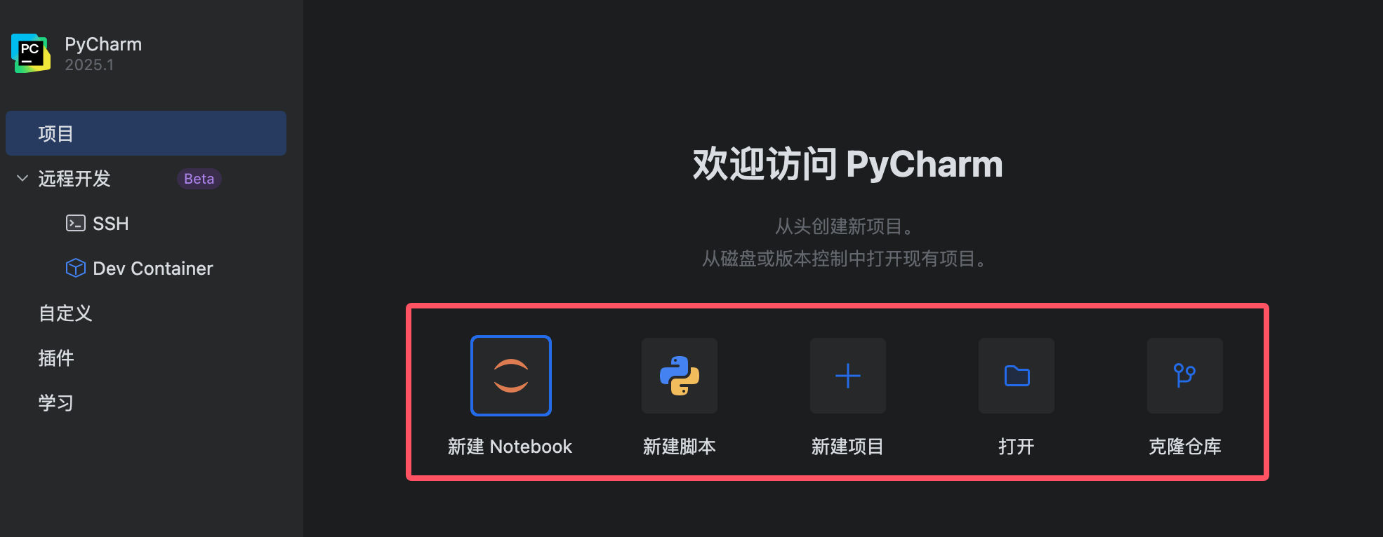 1. 创建新项目 1.1 从欢迎界面创建PyCharm 启动的时候其实已经提供了很多快捷方式: