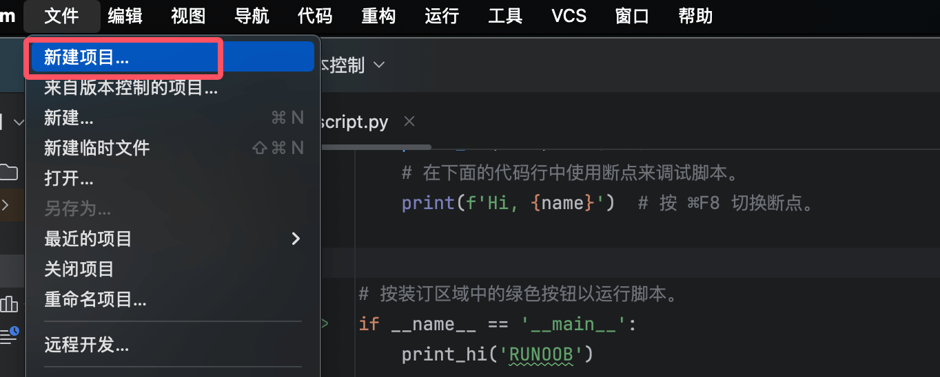 文件 → 新建 → 项目(File → New → Project),创建新项目(PyCharm 会提示是否在新窗口打开)。