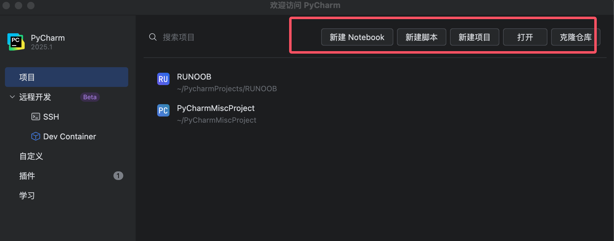 重新打开最近项目:欢迎界面会显示 "最近项目"(Recent Projects),点击即可重新打开。
