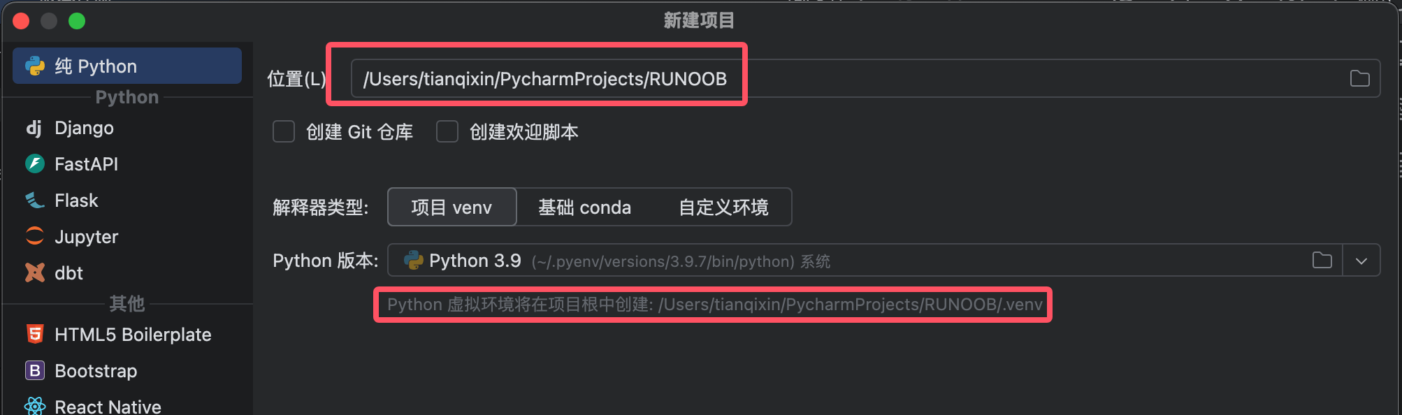 PyCharm 会自动检测 Python 环境,如果没有,可以手动配置解释器。
