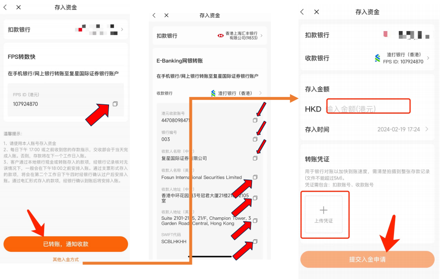 也可也通过FPS快速转账⽅式,进⾏存⼊点击右侧,即可“复制FPS ID” 通过⽹银转账⽅式,点击信息右侧按钮可以直接复制信 息,通过⽹银转账⾄此收款账户 填写⼊⾦信息,并附上转账记录,转账记录需要展示账户持有⼈姓名 和账户,不可以有隐藏信息
