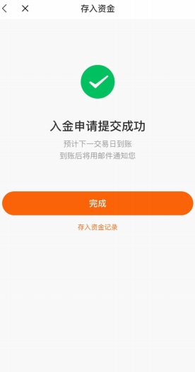 提交后,点击“完成”即可,资⾦⼀般在“1个⼯作⽇内”到账
