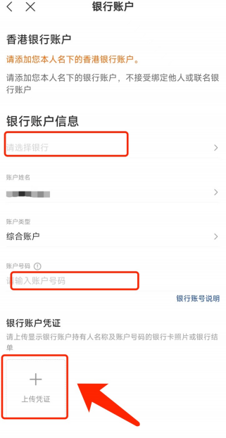 请如实填写银⾏账户信息。账户号码:为银⾏账户,请参考银⾏提供结单账户;上传凭证:此处需要上传银⾏结单,请记得上传“原图”