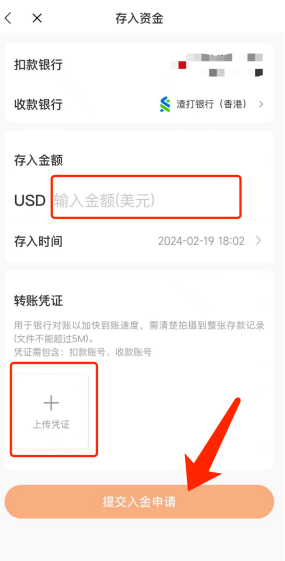 填写⼊⾦信息,并附上转账记录