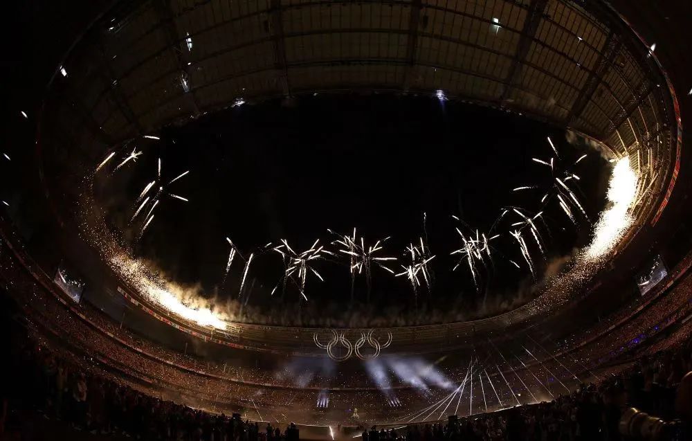 中国体育代表团旗手李发彬和欧紫霞入场。图源:新华社