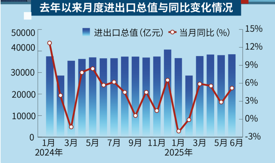7月14日,2025年上半年外贸“成绩单”发布。据海关总署统计,今年上半年我国货物贸易进出口21.79万亿元人民币,同比增长2.9%。