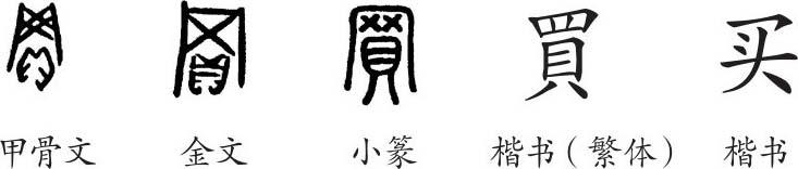 《说文·贝部》:“買,市也。从网、貝。如《孟子》曰:‘登垄断而网市利。’”(買,购进。由网、貝会意。《孟子》说:“登上独立的高地(窥视),(企图)网罗买卖的好处。”)