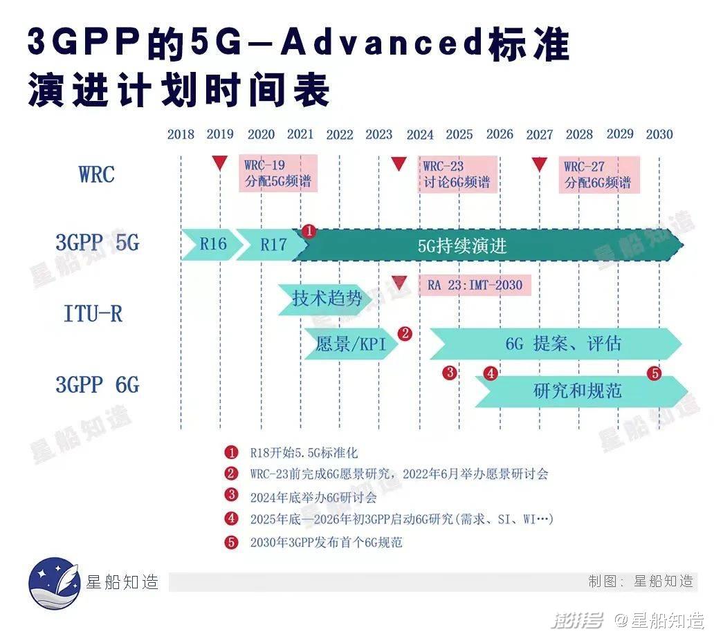 5G-Advanced的标准化工作将有R18、R19和R20三个版本,持续对原有5G的功能进行升级与完善,计划到2025年完成5G-Advanced最后一个版本R20的制定工作,详见下图