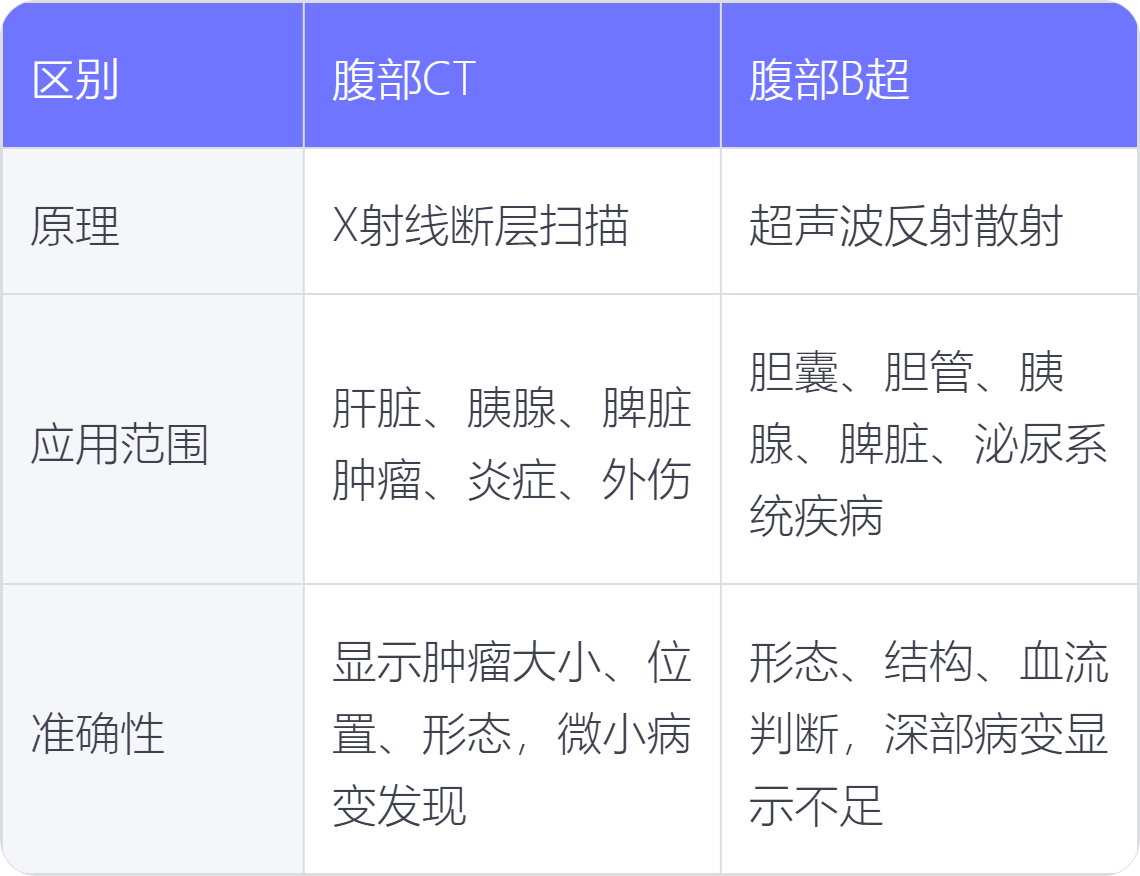 腹部CT是利用X射线对腹部进行断层扫描,然后通过计算机处理得到图像。腹部B超则是利用超声波在人体组织中的反射和散射来形成图像。