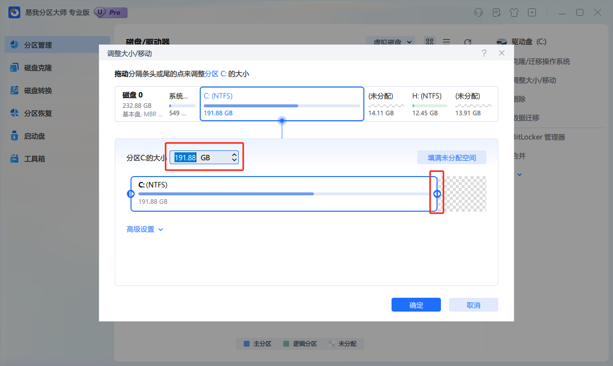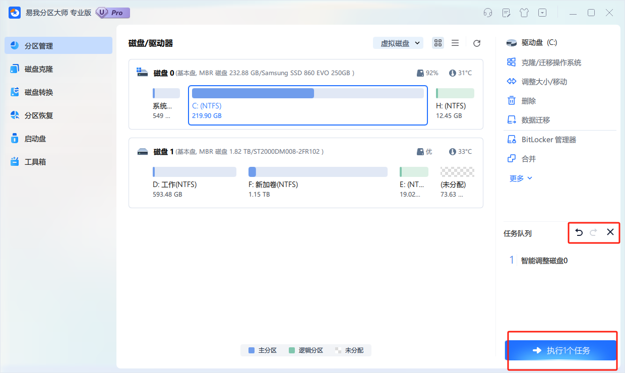 如果你的其他盘符还有多余的存储空间,我们可以使用专业的分区软件直接给C盘扩容。如,易我分区大师(EaseUS Partition Master Professional)。它能跨分区调配空间,即使未分配空间与C盘不相邻,也能强行“投喂”空间给C盘,并且操作非常简单!