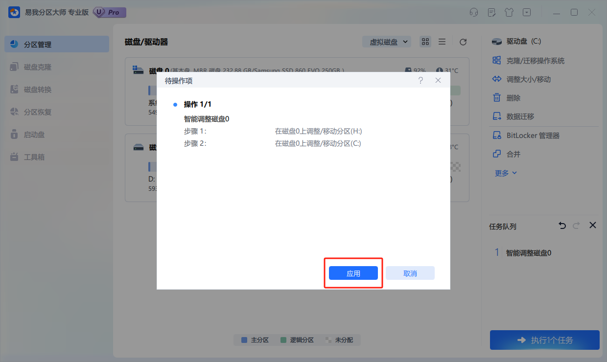 4.设置好后点击“确定”,并点击“执行1个任务”,可以在“任务队列”撤销上一步操作或者删除任务,随后点击“应用”。