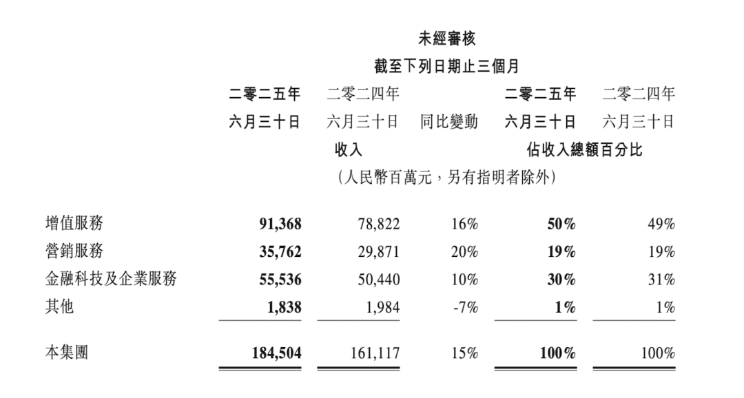 金融科技及企业服务业务收入同比增长10%至555亿元。金融科技服务的收入增长主要由于消费趋势的改善,以及消费贷款服务、商业支付活动及理财服务的收入增长;企业服务收入的增长则受企业客户对AI相关服务的需求增加,包括GPU租赁、API token使用与商家技术服务费的增长。