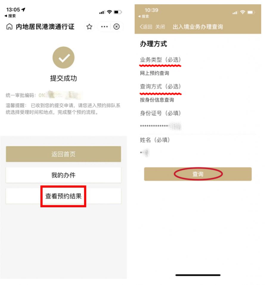 3、提交成功后等待1-2分钟后直接点击“查看预约结果”按键查看预审结果,若结果出来较慢或不小心退出界面,可以返回首页回到“出入境专栏”,下拉在“业务查询”种类中选择“出入境业务办理查询”,然后选择“业务类型”为“网上预约查询”,“查询方式”为“按身份信息查询”,点击“查询”查询预审结果。