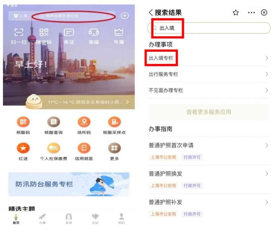 1、通过支付宝、微信进入“随申办”小程序,点击上方搜索栏,搜索“出入境”,点击下方“出入境专栏”。