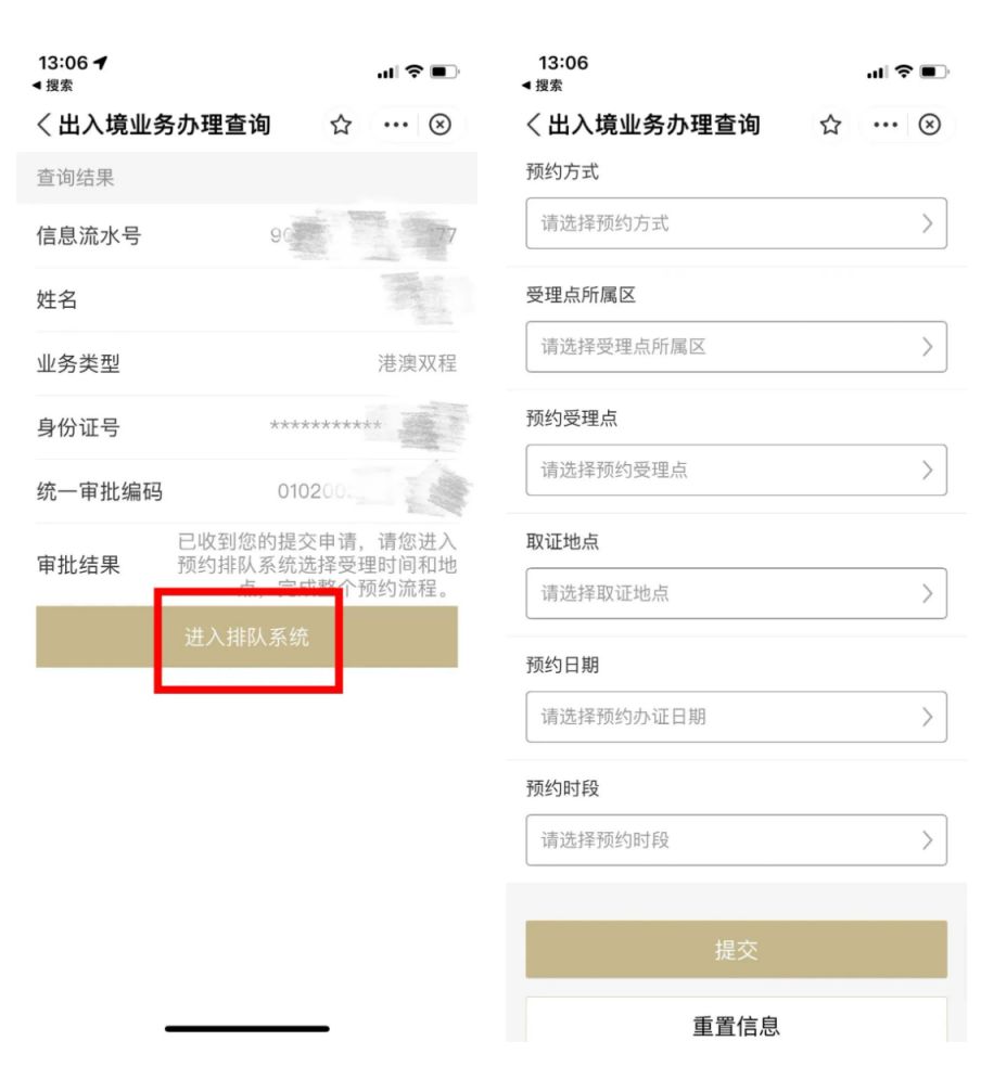 4、在“出入境预约查询信息”页面点击下方“进入排队系统”,填写预约办证时间和地点等信息,点击“提交”。