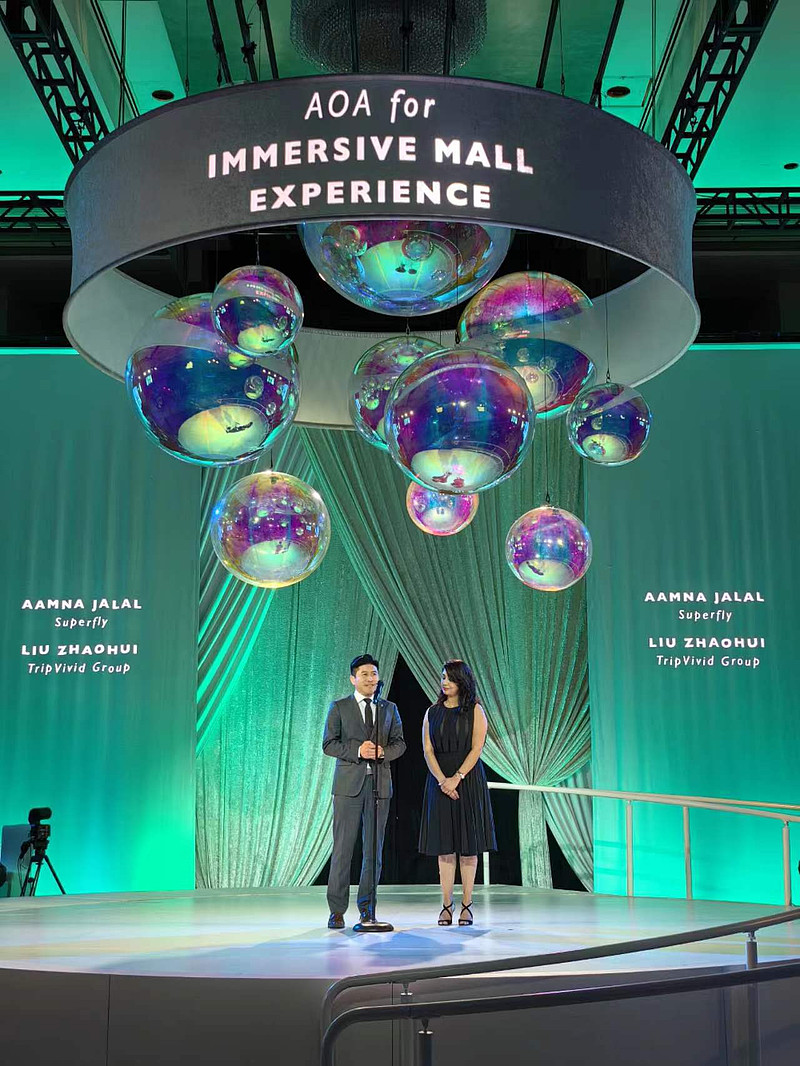 一、商业赋能,文商旅融合主流性渐显文商旅融合是主题娱乐的重要组成部分,购物中心的体验性和主题性已成为文商旅的主流趋势。我颁奖的项目是海口国际免税城AURA:天际秘林项目就是将数字赋能、视听效果与沉浸体验完美结合的代表。这个项目由曾五次获得奥斯卡金像奖的维塔工作室联合国内文体产业集成方案解决商大丰实业共同创作完成,其核心理念是,以数字艺术赋能商业场景,营造超乎消费者想象的购物体验。数据显示,这个项目至今已吸引450万游客,为海南离岛免税创造高达72.5%的贡献率。