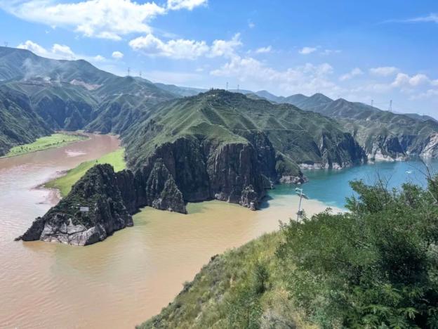 甘肃临夏州永靖县刘家峡大坝附近,黄河与洮河以“Y”字形交汇,形成了“黄洮交汇”的奇观。黄河水清澈碧蓝,而洮河则因携带大量泥沙呈现浑浊的黄色,两者相遇却不相融,形成了一条鲜明的分界线,宛如一幅天然的“鸳鸯锅”画卷。(林青摄)
