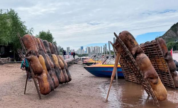 兰州羊皮筏子,俗称排子,是一种古老的水上运输工具,用羊皮做成。筏子有大有小,最大的羊皮筏子由600多只羊皮袋扎成,小皮筏系用10多个羊皮袋扎成,适于短途运输和渡送两岸行人等。(化冰供图)