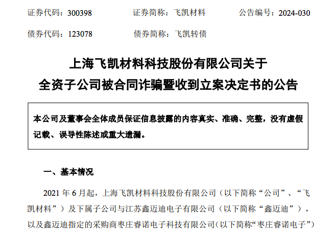 3月19日晚间,飞凯材料公告披露上述“合同诈骗案”详情。飞凯材料称,2021年6月起,飞凯材料及下属子公司与江苏鑫迈迪电子有限公司(简称“鑫迈迪”),以及鑫迈迪指定的采购商枣庄睿诺电子科技有限公司(简称“枣庄睿诺电子”)和枣庄睿诺光电信息有限公司(简称“枣庄睿诺光电”)开展贸易合作,并分别签署相关合同。主要业务流程为:飞凯材料或下属子公司向鑫迈迪采购产品并销售给枣庄睿诺电子和枣庄睿诺光电,枣庄睿诺电子和枣庄睿诺光电按签署的合同条款向飞凯材料或下属子公司支付货款。