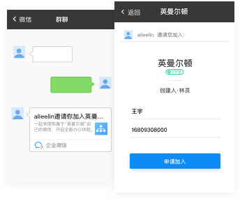 成功加入企业后,你可在消息列表右上角点击加号,在邀请同事入口用微信邀请同事加入。